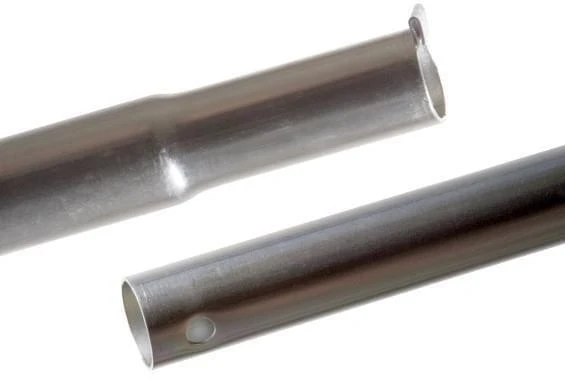 Verzinkt tussendeel met gat. Dit tussendeel van Campking heeft een lengte 900 mm (totaal; dikke deel: 845 mm) en een diameter van 28 mm (dikke gedeelte; verjonging: 25 mm).