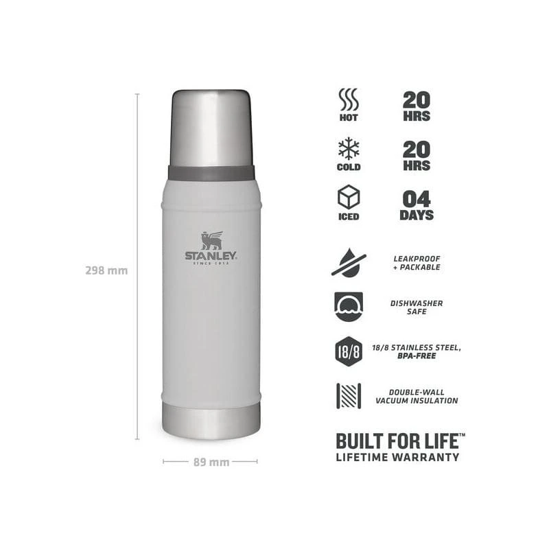 De thermosflessen van Stanley zijn gemaakt van extra sterk RVS waardoor je ervan verzekerd bent dat de fles tegen een stootje kan. De dubbelwandige fles houd dranken urenlang warm of gekoeld. Ook de dubbele dop draagt bij aan het isolatievermogen van de thermosfles, deze dop is ook als kopje te gebruiken.